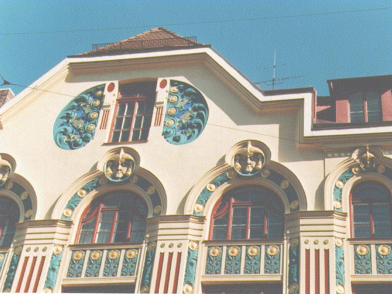 The main area for Art Nouveau builings is in Schwabig village. The Jugendstil was named after the art and design magasine "Jugend" which was created in 1897 in Munich. According to some people, it was pure hazard that it has been created in this town as Munich inhabitants where very conservative. There are lots of Jugendstil buildings in Munich and particularly in the Schwabig quater. These buildings are often very similar to the standard Munichan house except that they have a Jugendstil stuccos instead of baroco ones. It is very rare to find a stone building. Most of them are covered with a neattly painted roughcast or coating. Jugendstil architects often play with surface and color effects on the roughcast. The stucco patterns are representing owls, peacocks and vegetals. Geometrical patterns are rarer. The wellknown Jugendstil woman face is also widely represented. The houses are often cubic with regularly spaced windows, some of the AN buildings use a more modern structure with large window bays. Curves come with height in the roofs that are inspired by tradition. The most wellknown facade of Munich disapeared with world war II (Elvira Workshop by Endell 1898).