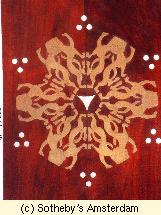 The cover is executed in the batik technique. Batik originally is an Indonesian technique for decorating textiles. The cloth is covered with wax at the places where no colour is wanted. After immersion in a bath with pigment the wax is removed. This proceure is repeated for every colour separately. Batik is one of the techniques which distinguishes Dutch Art Nouveau, although some German artists later also used it. Dutch batiks are different from Indonesian ones in the designs used, and dutch artists also used the technique on different materials than textile, like leather or wood.
