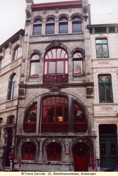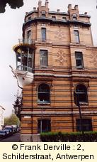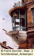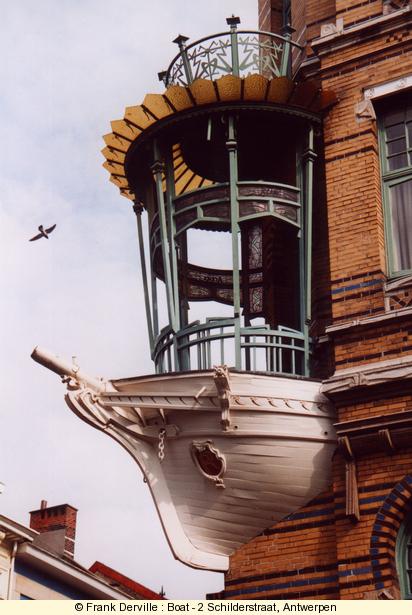 The Five continents, 2, Schilderstraat by Smet Verhas in 1901. The owner was an "armateur" which explains the boat shape balcony. There is also a wonderful iron lamp behind the boat. |