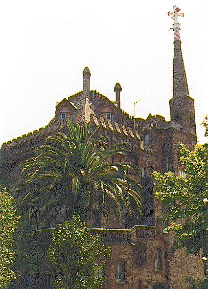 The park Guell was inspired by the English theories about garden cities. The place is a mounty area with a view to the sea. Because of the slope, Gaudi created some u turn roads supported by pillars to give an access to every planed house. The village was centered around a covered market and on its top a large place surrounded by a snaky bank skined with broken pieces of ceramics by Jujol. It was first planed to build as much as 60 houses of which 4 only were built: the Conciergerie and the welcome house in a mushroom shape, the Dr Trias'house, the Casa Museu Gaudi by Domenech i Montaner in 1904 where Gaudi lived from 1904 and 1926. This house is now transformed in a museum. The backgroung image is inspired from the border of Casa Gaudi windows. | ![]() ![]() |
