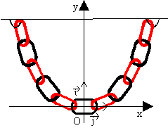 2 (the spawn(ed?) by and , and at home it's the plan of your computer screen). Of these considerations of symetry, We can conclude that the solution is also include in the plan P2 (i.e. your screen) and is symetrical by the mediatrice of [GG'] (i.e. the vertical line going by the middle of GG'). Two axes: horizontal ox, vertical oy with their associated unity vectors andLet us consider the subsystem of the chain between -l and l. This system is also symetrical and immobile. We can apply to it the law of the equilibrium of forces. gravity P=-2lmlgj, F(l)=Fx(l)i+Fy(l)j and F(-l)=Fx(-l)i+Fy(-l)j. Projecting on the axe oy, we get the equation: -Fy(-l)+Fy(l)-2lmg=0. We can add for symetry reasons that Fy(l)=-Fy(-l) so the equation becomes 2Fy(l)=2lmg that is Fy(l)=lmlg.