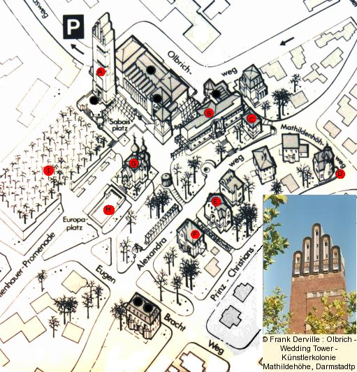 The Künsteler Kolonie quaterIf you have the opportunity to go to Darmstadt, visit the Artist Colony (Künstlerkolonie) on the Mathildehöhe quater. It is the place where most of the AN buildings are. It is small but the quater was entirely designed by AN artists. There are still very few of these Art Nouveau areas : Cogels Osylei in Antwerpen, Mers les Bains in France... This 3D map is displayed near the entrance of the Museum Kunstler Kolonie. I have only modified the pins to adapt it to the web and my Art Nouveau touristic view. |