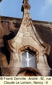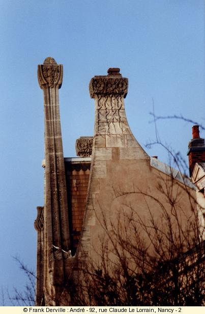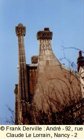 already used some floral designs. Here are two details of this house: a marvellous example of Art Nouveau doors and one chimney. The door is topped by pine cone decorations which are a recurrent design in Nancy AN works. The chimneys are decorated with flowers which leaf shape reminds flames as well as sunflowers. |