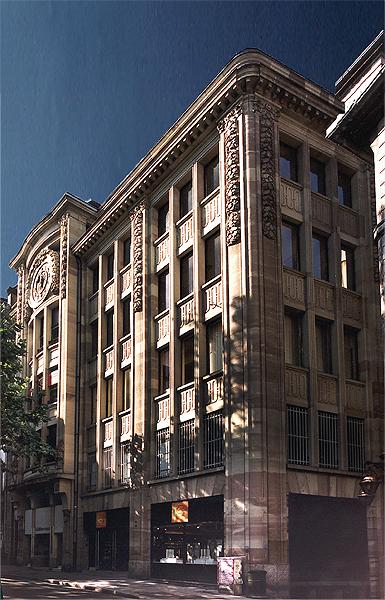 (4). In 1911, an extension were built on 10, place du Temple Neuf (and corner rue des Dominicains). For the façades of the latter ashlar has been prefered to iron. The pillars, numerous and imposing, emphasize the impression of verticality. Art nouveau is already more discreet (garlands, and bouquets). The come back to stone and the overall look of that new façade features the german department stores built before World War I. The link to the Tietz