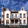 (2) flanking two bays preceded with a loggia adorned with sculptures and wrought iron and limited with a cornice wearing a frieze. The