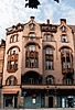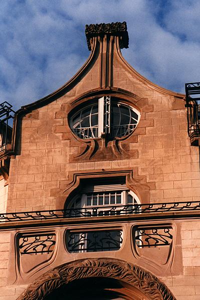 The appearance of symmetry is denied by the bays, each other being different. We successively can observe a bow-window, followed by an oriel, a flat bay and then a loggia.