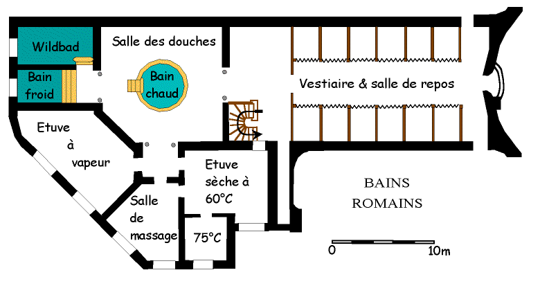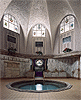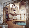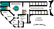Entering between two rows of wooden alcoves, you are invited to jump into your birthday's suit before to go to the steam room (45°C). Some steps guessed through the fog suggest you to take place. In a corner, a fountain dispenses its lapping. On the wall, a strange brass device allows you to spray yourself with steam, giving you a ghostly appearance. Now, that you are moistened, you are ready to enter the dry-steam room (60°C) where beds made of teak wood are awaiting you. Nearing your melting point, you stoically enter the small vaulted room at 75°C, lit by a circular stained glass