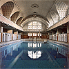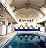 big pool (80x39 ft) stretches out between two rows of wooden cubicles, begins with a fountain adorned with a