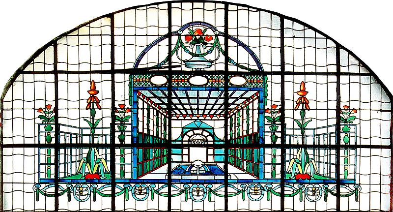 The whole area it lit by stained glass windows. In a background filled with ocre tiles and brass showers, we can find again art nouveau stained glass