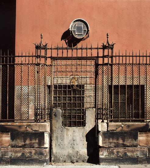 Let's climb the stair that spans a fence to enter an elliptic rotunda. Two bathers are welcoming you down from their pedestal.